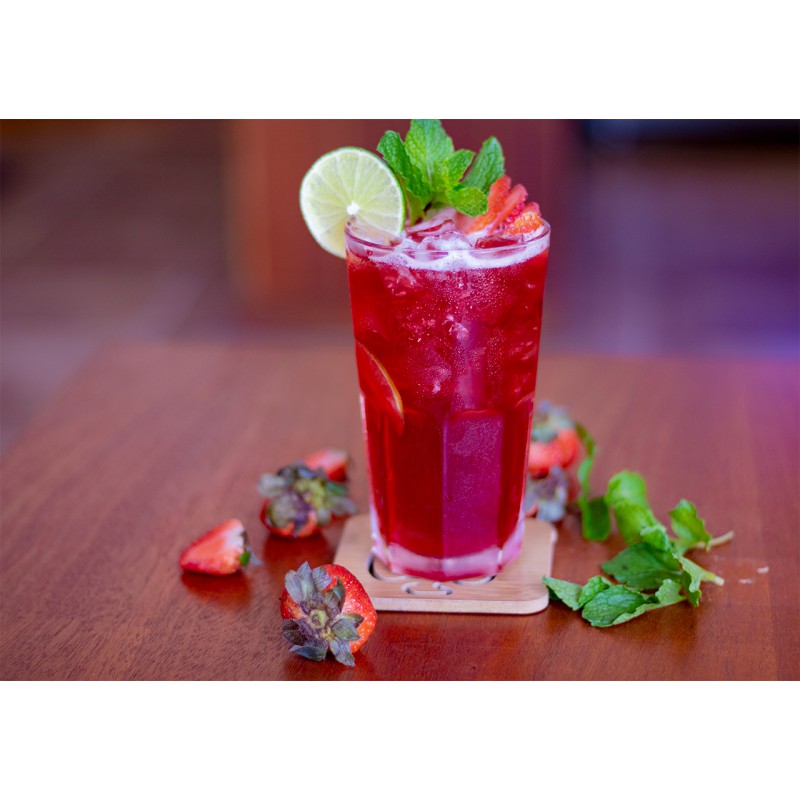 - Bước 3: Cho nước ép dâu tây, 30 ml nước đường cát, 5 ml nước cốt chanh, vài giọt syrup hoa bụp giấm và đá viên vào bình lắc. Có thể cho phần nước ngâm dâu vào lắc chung. Lắc đều bằng lực cổ tay đến khi thấy bình lạnh thì cho nước ép dâu tây ra ly rồi trang trí với một quả dâu tây tươi hay một cọng húng lủi để thức uống thêm hấp dẫn.